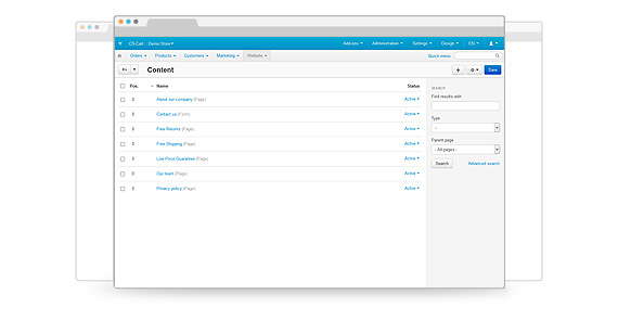With CS-Cart platform you can create, edit and publish different types of content including static pages, polls, newsletters, customer testimonials, contact forms, banners in text or picture format and many more. The menu-builder makes the storefront navigation clear and easy to use for your web store clients.